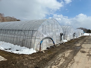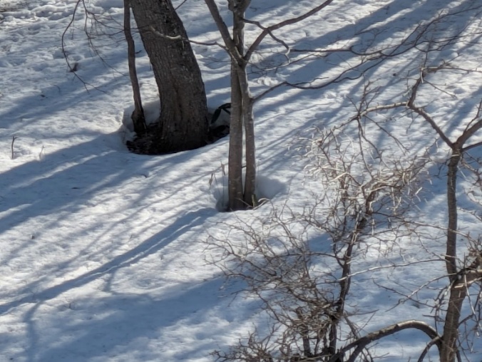 樹木の根元の雪は周囲より早く解け、すり鉢状の穴になり、穴から木が生えているように見えます。この現象を「根開き」と呼ぶようです。